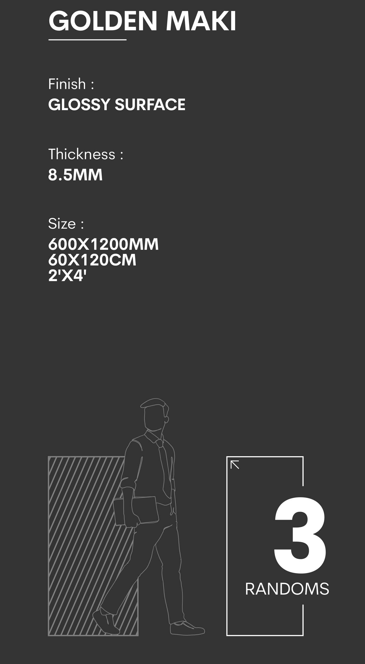Finish : Glossy surface , size : 2’x4′, Weight (kg): 27.5 , height: 8.5mm