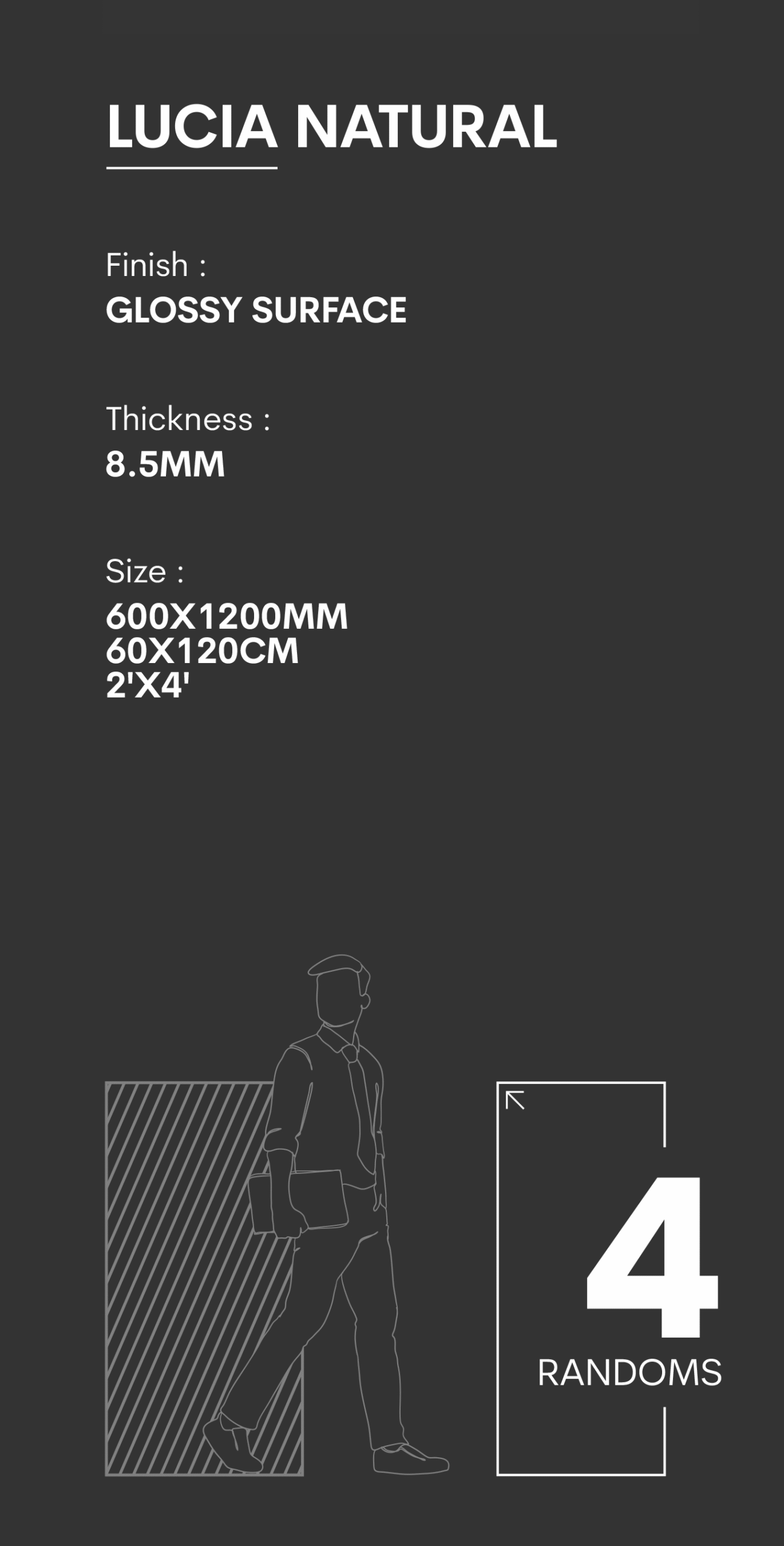 Finish : Glossy surface , Size : 2’x4′, Weight (kg): 27.5 , Thikness: 8.5mm