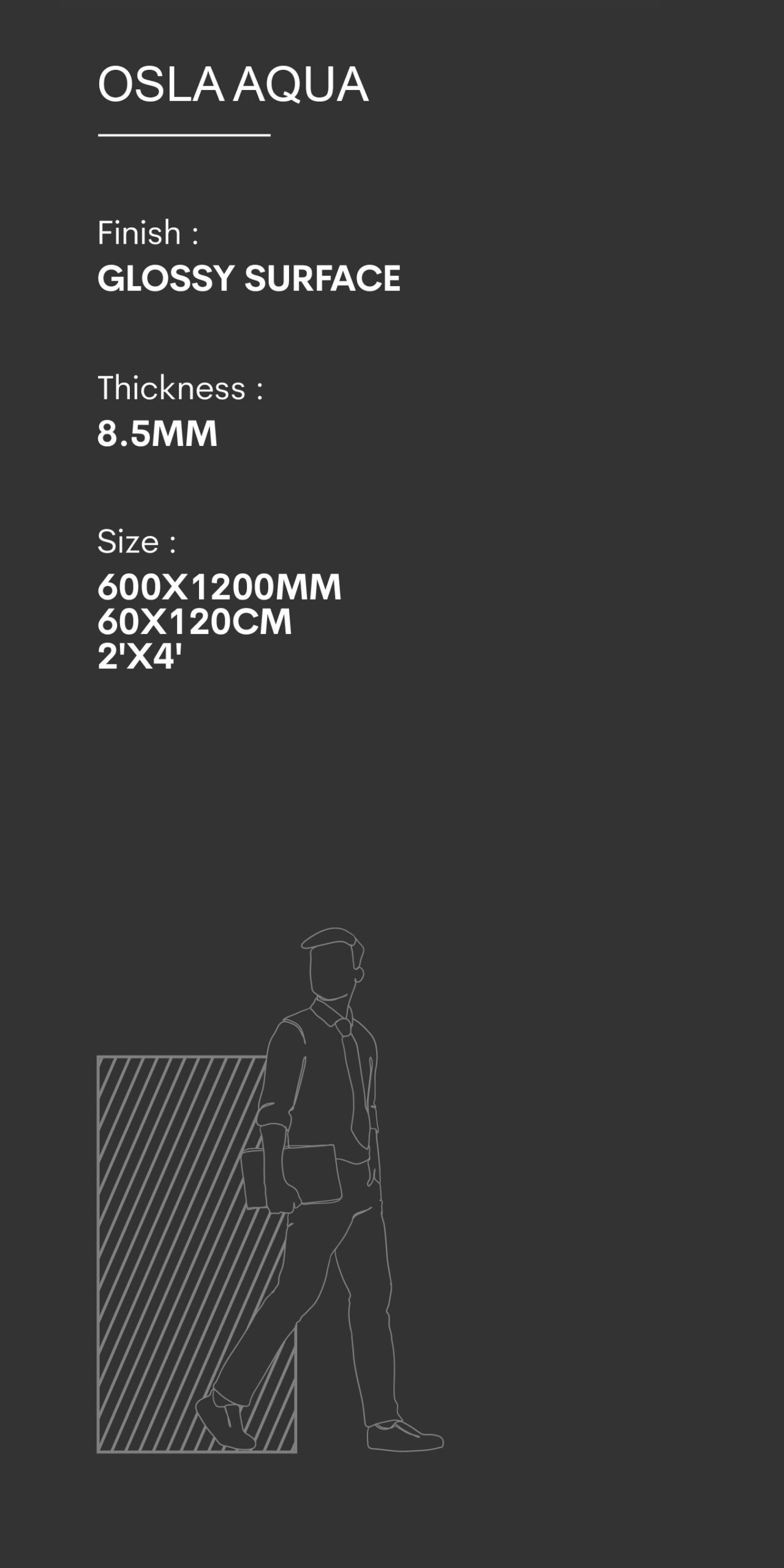 Finish : Glossy surface , Size : 2’x4′, Weight (kg): 27.5 , Thikness: 8.5mm