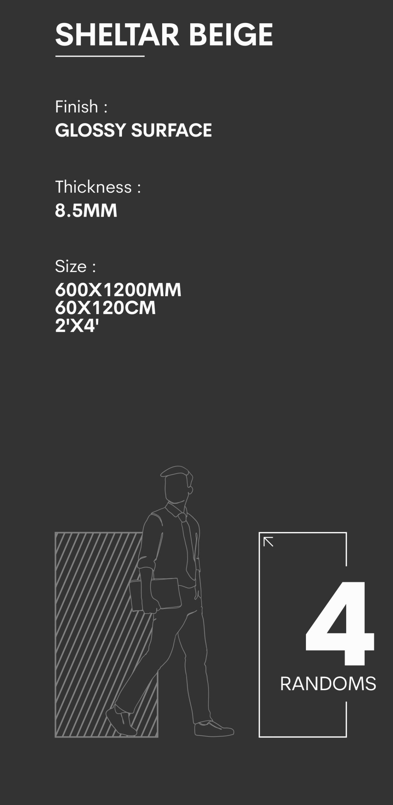 Finish : Glossy surface , Size : 2’x4′, Weight (kg): 27.5 , Thikness: 8.5mm